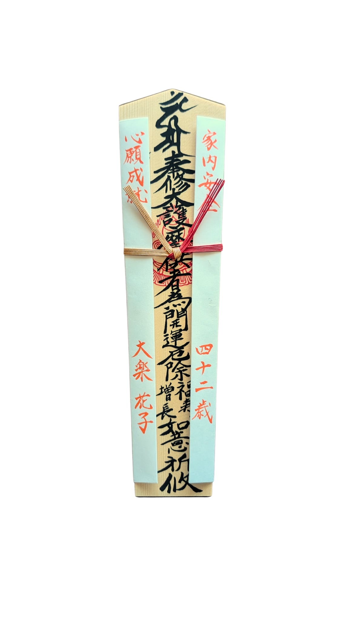 手書きで表側に朱でお名前と数え年を書いております。
